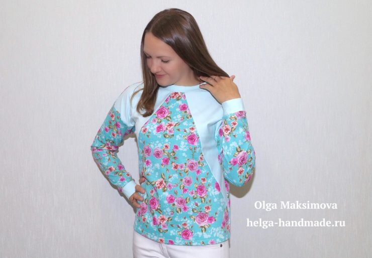 Выкройку переносим на ткань. У меня: с розами — футер с начёсом, однотонный мятный — футер 2 нитка с лайкрой. Для манжет и горловины лучше использовать кашкорсе или рибану. Начнем с передней части свитшота. Соединяем все 3 детали полочки, сколов их булавками. Шить лучше на оверлоке, но если у вас его нет, то можно на швейной машинке оверлочным швом, используя иглы для трикотажа. На каждом этапе отутюживаем швы. Затем соединяем перед и спинку свитшота в плечевых швах. Расправляем перед и спинку и в пройму вшиваем рукав. Складываем свитшот по плечевым швам и с изнаночной стороны сшиваем на оверлоке, где отмечено пунктиром (предварительно сколов булавками). Приступаем к манжетам. Деталь манжет сшиваем меньшими сторонами в кольцо. Сгибаем по кругу. Срезы швов на манжете