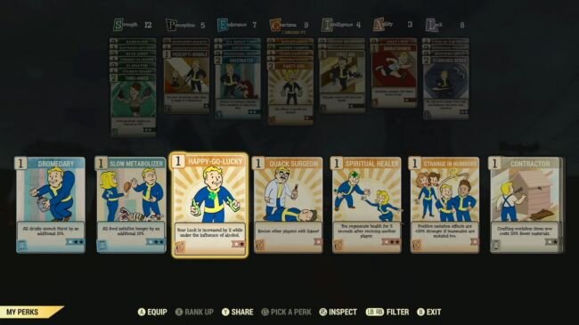 В Fallout 76 будет создана система на основе карточек, в которой вы можете делиться перками с другими игроками и менять свои перки каждый раз, когда вы повышаете свой уровень. На каждом уровне вплоть до 50 уровня вы будете выбирать точки в одном из ваших «S.P.E.C.I.A.L.» показателей - Сила, Восприятие, Выносливость, Харизма, Интеллект, Ловкость и Удача - и выбирать карту перка, предлагающих более 100 вариантов различных баффов. Например, карта «Happy Go Lucky» увеличивает ваш показатель удачи в 2 раза, когда вы пьяны, «Гладиатор» увеличивает урон от одного оружия на 10%, а «Попрошайка» дает шанс 50/50 найти дополнительные боеприпасы в контейнерах. Но в отличие от прошлых игр каждая карта перка будет иметь связанную стоимость очков и будет связана с одним S.P.E.C.I.A.L. показателем. Вы можете только экипировать карточки до значения соответствующего S.P.E.C.I.A.L показателя: например, с показателем силы три, вы можете, например, оборудовать только три карты с одной точкой перка. Вы так