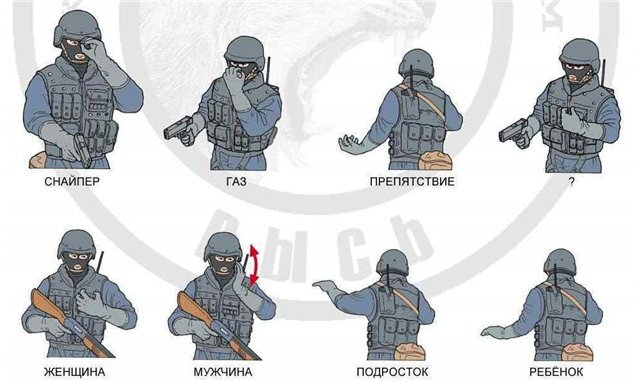 Тактические жесты спец.подразделений, это не догма, а пример, в каждом подразделении может быть наработанна своя система общения в группе.