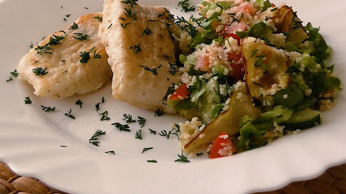 ПРЕДЛАГАЮ ВАМ ЗАМЕЧАТЕЛЬНУЮ ИДЕЮ ОЧЕНЬ ВКУСНОГО И БЫСТРОГО УЖИНА! ВСЯ СЕМЬЯ БУДЕТ ДОВОЛЬНА!!! А ВЫ НЕ ПРОСТОИТЕ У ПЛИТЫ ВЕСЬ ВЕЧЕР! ИНГРЕДИЕНТЫ📝 -600 гр рыбы -2 помидора -1 огурец -1 кабачок -салатные листья и укроп -мука 3 -5 стол.л -соль и перец по вкусу -оливковое масло ПРИГОТОВЛЕНИЕ✅ 1.СНАЧАЛА ПРИГОТОВИТЬ КУС-КУС.ЗАЛИТЬ ЕГО СТАКАНОМ КИПЯТКА, ПРИСОЛИТЬ ,ПЕРЕМЕШАТЬ И ОСТАВИТЬ НАБУХНУТЬ НА 10 МИНУТ.ВОТ И ВСЁ ЕГО ПРИГОТОВЛЕНИЕ! 2.ЗЕЛЕНЬ И ОВОЩИ НАРЕЗАТЬ ТАК КАК ВАМ НРАВИТСЯ! 3.КАБАЧОК ОЧИСТИТЬ И НАРЕЗАТЬ НА СЛАЙСЫ.ТАК ОН БЫСТРЕЕ ПОЖАРИТСЯ И БУДЕТ ОЧЕНЬ ВКУСНЫМ. 4.К ЧАСТИ МУКИ ДОБАВИТЬ СОЛЬ И ПЕРЕЦ И ОБВАЛЯТЬ СЛАЙСЫ В ПАНИРОВКЕ. 5.ОБЖАРИТЬ НА ОЧЕНЬ ХОРОШО РАЗОГРЕТОЙ СКОВОРОДЕ С НЕБОЛЬШИМ КОЛИЧЕСТВОМ МАСЛА. ВЫКЛАДЫВАТЬ НА БУМАЖНЫЕ САЛФЕТКИ,ЧТОБ УДАЛИТЬ ЛИШНЕЕ МАСЛО! 6.К ОВОЩАМ ДОБАВИТЬ КУС-КУС, ДОБАВИТЬ КАБАЧКИ,ПОРЕЗАННЫЕ НА ТРИ ЧАСТИ 7.ДОБАВИТЬ ОЛИВКОВОЕ МАСЛО, СОЛЬ И ХОРОШО ПЕРЕМЕШАТЬ! САЛАТ-ГАРНИР ГОТОВ! 8.ОСТАЛОСЬ ОБЖАРИТЬ РЫБУ! ПРИГОТОВИТЬ ТАКУЮ ЖЕ ПАНИРОВКУ ,КАК ДЛЯ КАБАЧКОВ.О