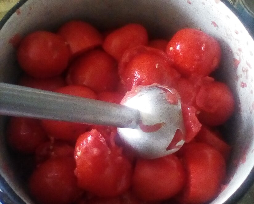 Название я, конечно, придумала - по имени любимой тётушки, которая и поделилась этим рецептом. Пользуясь случаем - она меня читает - тётя Галя, привет! Итак, для заготовки нам понадобятся: На моё количество продуктов на фото не смотрите, я делала большее количество салата, поэтому высчитала пропорции. Из вышеназванного количества должно получится примерно 4 баночки по 0,5 литра. Помидоры (и перец, если кладёте) превращаем блендером в кашу. Можно прокрутить на мясорубке. Добавляем в красивую жидкость растительное масло, соль и сахар. Ставим на плиту. Доводим до кипения и кипятим ровно 5 минут. В это время режем тонкими кружочками огурцы... ... и давим чеснок (я в блендере измельчаю). Когда помидорный соус закипел, закидываем туда огурцы и кипятим 3 минуты. По истечении этого времени в кастрюлю отправляем чеснок и уксус, после чего кипятим 1 минуту, не больше. Очень важно соблюдать пропорции и время приготовления, чтобы не получить на выходе варёную кашу. Наш салат готов, осталось ра