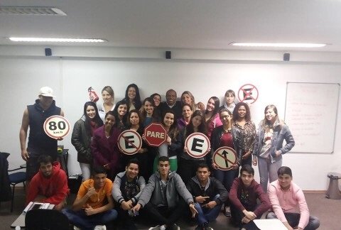 Это наша группа на момент фотографии, а так состав каждый день разный. Кто-то заканчивает, кто-то начинает. В середине толпы наш инструктор Барбоза. Я в заднем ряду справа, держу знак «остановка и стоянка запрещена») Футболист стоит слева, такой бугай в белой кепке.