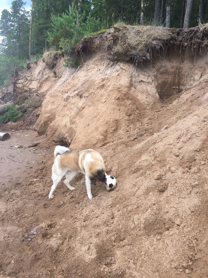 Разорвала мяч. Это моя любимая игрушка. Только мячом я хочу играть, но не долго длиться моя игра с ним. Снова купалась в зеленой воде. На улице надо мной смеются, оттенок, говорят, модный в этом сезоне. Я пыталась понять почему упала эта большая палка. Искала ответы под водой. Не нашла. Пусть останется загадкой. Капала ямы. Люблю очень это дело. Выкопаешь порой ямку, ляжешь в нее, заснешь. Просыпаешь, а уже и кушать пора. Хотела найти себе новых друзей. Но мне не разрешили! ((( Хотя спрос вон какой. Я хочу с такими дружить.