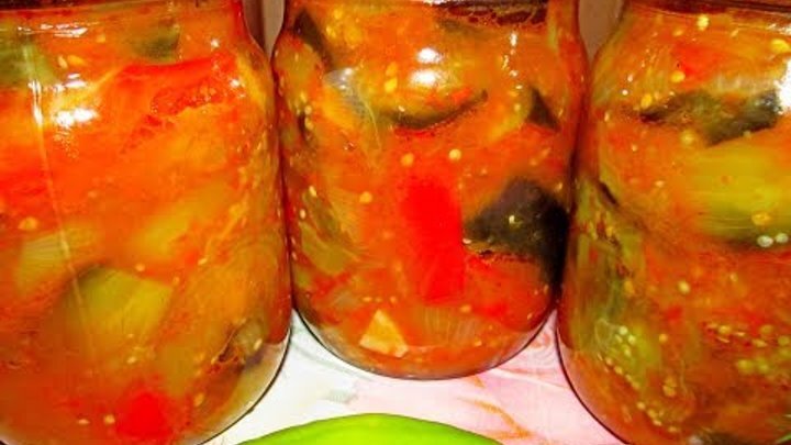 Очень вкусный салат на зиму. "Уплетается" за милую душу. Только добавки хочется. Легко приготавливается, больших затрат не надо. Готовьте и кушайте на здоровье! Вот рецептик. ИНГРЕДИЕНТЫ баклажаны (небольшие)-10 штук сладкий перец-10 штук репчатый лук (средний)-10 штук помидоры-10 штук чеснок-10 зубчиков соль-1 ст. ложка сахар-100 грамм уксус-50 грамм растительное масло-1 стакан ПРИГОТОВЛЕНИЕ Баклажаны режем крупными кубиками, солим и оставляем на некоторое время. А пока нарезаем крупно перец, помидоры и лук. Мелко рубим чеснок. В глубокую кастрюлю выкладываем баклажаны, перец, помидоры и лук. Хорошо перемешиваем. Вливаем масло, добавляем сахар и соль и тушим 30-35 минут на небольшом огне. Затем добавляем уксус и тушим ещё минуток 10. За две минуты до конца варки добавляем чеснок. Раскладываем по стерилизованным банкам, закатываем. Переворачиваем горлышком вниз и укутываем. Оставляем до полного остывания. ПРИЯТНОГО АППЕТИТА!