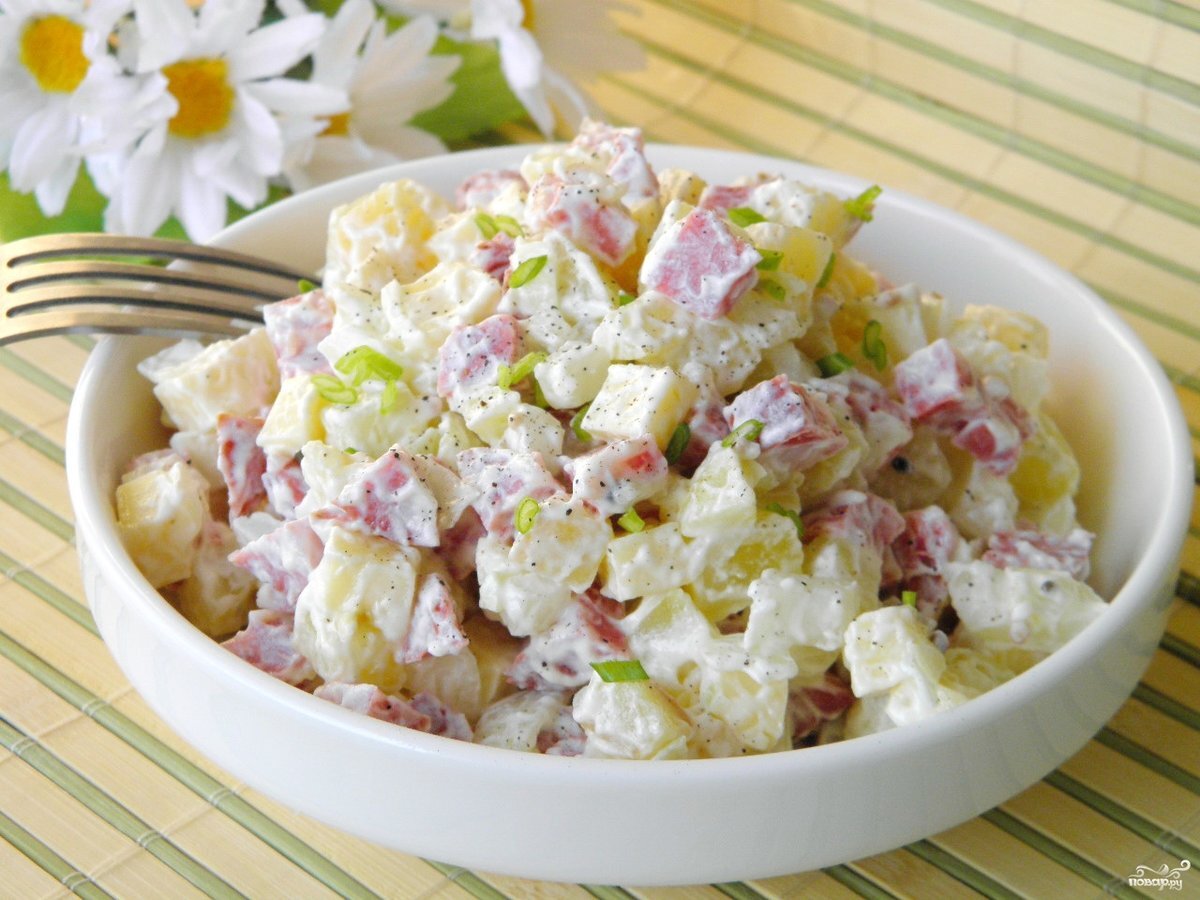 Салат летний из молодого картофеля. Для того, чтобы приготовить данный салат вам понадобиться: 500-600 гр молодого картофеля, 150-200 гр свежих огурцов, 100-150 гр зеленого лука, 50-75 гр зеленого салата, 2-3 яйца, 2-3 свежих помидора, 150-200 гр майонеза или сметаны, 25 гр зелени петрушки или укропа, соль перец. Вареный очищенный охлажденный картофель нарезать кубиками, свежие огурцы нарезать тонкими ломтиками, варенные яйца нарезать кубиками. Зеленый лук мелко нашинковать, листики зеленого салата нарезать соломкой. Продукты заправить майонезам или сметаной ( или тем и другим в равном соотношении) посолить, поперчить и хорошо перемешать. Также в данный салат можно добавить колбасу, нарезанную кубиками, с ней салат станет еще вкуснее. Салат готов! Приятно аппетита! Ставьте лайк и подписывайтесь на мой канал.