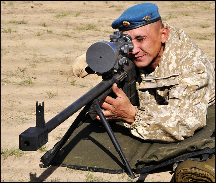 Крупнокалиберная дальнобойная винтовка «Корд» , самая мощная крупнокалиберная винтовка России.Масса чуть больше 12 кг, начальная скорость выстрела 850 м в секунду , длинна 1400 мм, убойная сила до 1500 м, четырехкамерный дульный тормоз,размер боеприпаса 12,7 мм.
