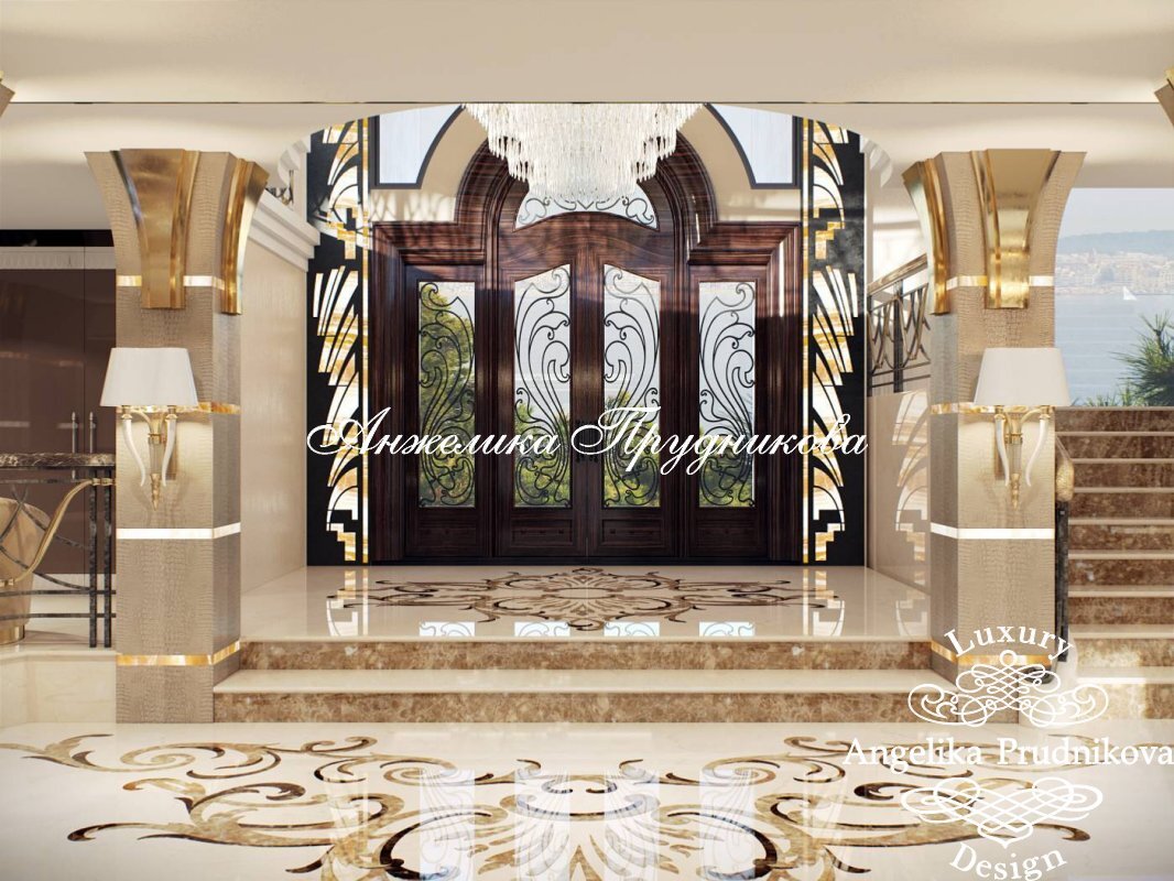 Дизайн дома в Испании полностью соответствует представлениям о богемном образе жизни. Достаточно лишь сказать, что в гостиной здесь почетное место занимает рояль с зеркальной крышкой, как воображение сразу же нарисует образ композитора или оперной певицы. При входе в дом посетителей встречают деревянные двери с прозрачными вставками, украшенными модерновыми узорами. Использованные в декоре входной группы витражи в черно-золотистых тонах повторяются в столовой. Первый этаж дома в Испании дизайнер Анжелика Прудникова организовала по принципу студии. Большая площадь без обращения к каким-либо элементам зонирования и перегородкам позволяет сформировать здесь вполне самостоятельные функциональные области. Диванная зона вместит как домочадцев, так и всех слушателей домашнего концерта. Столовая продолжается кухней, которая, благодаря прозрачным раздвижным перегородкам, кажется частью студийного пространства. Кухонное помещение с респектабельными креслами Честерфилд и перламутровым гарнитур