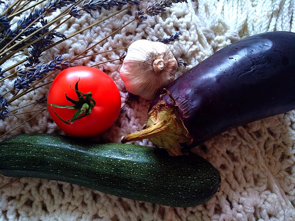 Итак. Вам понадобится один симпатичный фиолетовый баклажан небольшого размера, такой же по размеру кабачок, желательно молоденький, с нежной мякотью без семечек. Цукини подойдёт идеально. Также Возьмите хорошие помидоры, по весу столько же сколько кабачок или баклажан. Дополнительно вам понадобится соль, немного оливкового масла, вкусный соевый соус, растительное масло для жарки, пару зубчиков чеснока и зелени базилика или любая другая для украшения блюда.