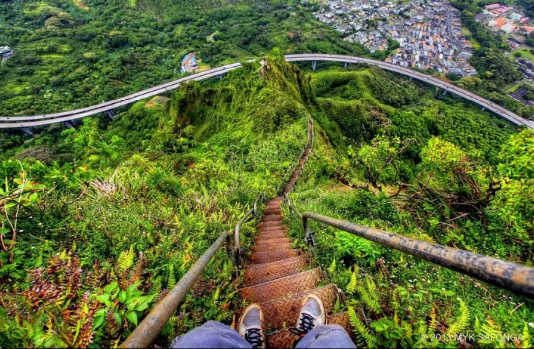 Эта лестница один из самых экстримальных туристических маршрутов на Гавайях. Лестница состоит почти из четырех тысяч ступенек и ведет на вершину высотой 850 метров. Построенна была она в 1942 году для нужд военных. На вершине стояли антенны и передавали сигналы подводным лодкам ВМФ США на большие расстояния. В 1987 году эта летсница стала уже маршрутом для туристов. Её оборудовали для безопасности пешеходов. Были заменены все ступеньки. Этот подъем настолько крут, что удержать равновесие при подъеме, кружащем голову, очень сложно. Даже опытные скалолазы не всегда могут удержать свои эмоции при таком маршруте. Хайку то закрывают, то открывают... Потому что велика вероятность несчастных случаев на этом маршруте. Но не смотря на это, туристы, приезжая на Гавайи скорее берут билетик на мост, ведущий в небеса.