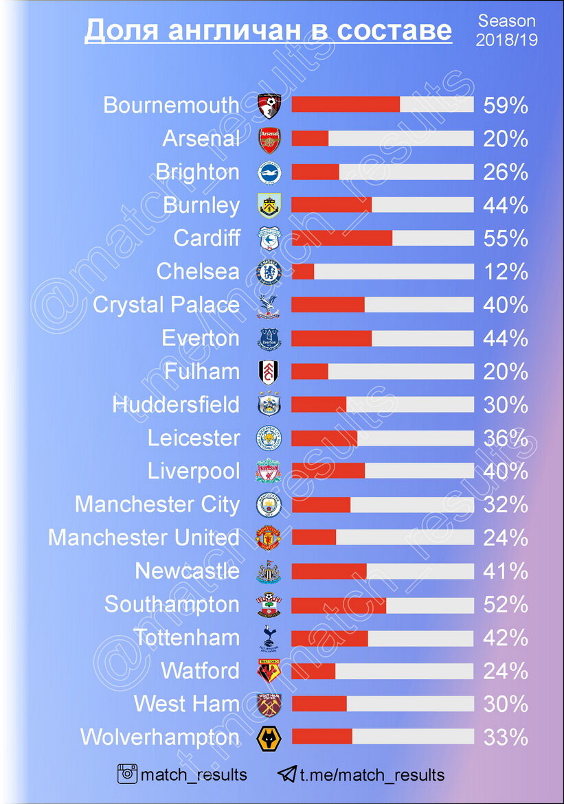 Знаете ли вы какая команда в английской Премьер-лиге в сезоне 2018/19 годов самая английская? Если критерием английскости выбрать процент игроков с английским гражданством, то на этот вопрос достаточно легко ответить. Топ три "английских" клуба выглядит так: Борнмут (59% англичан в составе), Кардифф (55%), Саутгемптон (52%). Топ три самых "не английских" клуба Фулхэм (20%), Арсенал (20%), Челси (12%).