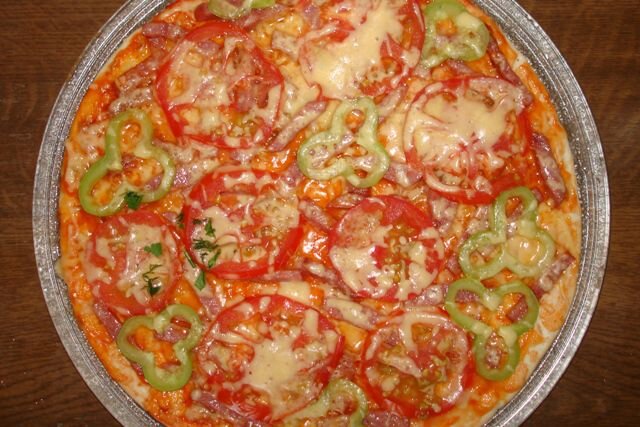 Тесто получается тоненькое и хрустящее. Сказочная вкуснятина! Для наполнения можете использовать все, что есть на данный момент в холодильнике. Разнообразие начинки для пиццы просто зашкаливает: мясо, ветчина, грибы, овощи и даже фрукты. Сегодня приготовим из филе курицы и овощей. Понадобится: Для теста: 200 мл воды, 3 стакана муки, 2 ч. л. сухих дрожжей, 2 ч. л сахара, 1 ч. л. соли, 3 ст. ложки растительного масла. Смешайте дрожжи в теплой воде, дайте постоять, пока не запенятся. Добавьте сахар, один стакан муки и соль. Через 20-30 минут влейте масло и постепенно вмешивайте оставшуюся муку. Поставьте на два часа в теплое место. Затем разминайте руками и растягивайте, чтобы получился круг. Если тесто возвращается назад, отставьте еще на 15-20 минут. Положите на противень. Скалкой пользоваться не желательно. Смажьте 50 г острым томатным соусом, выложите 100 г тонко нарезанное филе курицы, сверху порежьте кружочками три помидора, 200 г сыра нашинкуйте на терке и посыпьте. Украсьте 100