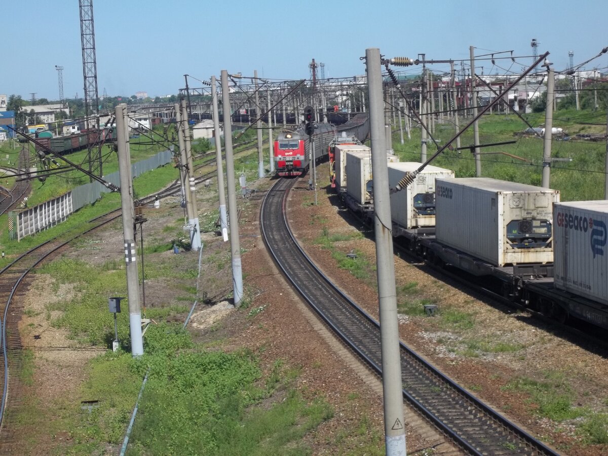 Приветствую всех и в этот день был праздник день железнодорожника. А это значит что кабины для обычных людей будут открыты, ведь это единственный день когда можно попасть в кабину локомотива и потрогать, пощелкать и поснимать то что не доступно в обычные дни -кабины локомотивов. Так как я железнодорожный фанат и блогер я обязан был пойти и потрогать все это своими руками. Хотя я и не только в этот железнодорожный день был в кабине машиниста, но все таки радости хоть отбавляй. Для того что -бы добраться до места выставки я должен был преодолеть виадук и сортировочную горку. Когда я подошел к виадуку, то достал камеру, вдруг что попадется. И вы знаете не прогадал, по главному пути в сторону Владивостока ехал товарняк с локомотивом 3эс5к-831. Он выходил на главный путь из запасного. И это выглядело так красиво. Я сделал пару фотографий, когда он вдали и когда подъехал ближе. Вот смотрите сами он выглядит как ползущая змея. Когда подъехал поближе. После того как я преодолел виадук, то м