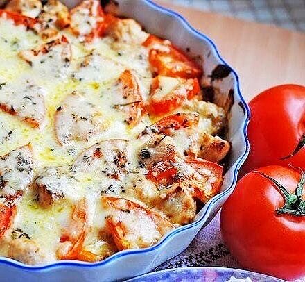 Ингредиенты: 3 куриных филе 1 сладкий перец 2 небольших помидора 1 ч.л. муки 120 мл. молока 1 ст.л. томатной пасты(или кетчупа) 1 ст.л. сливочного масла 1 луковица 2 зубчика чеснока 40 г сыра Растительное масло Соль,черный молотый перец Орегано,базилик Приготовление: 1) Лук нарезать мелко и вместе с чесноком обжарить на растительном масле около 3 минут, добавить мелко нарезанный перец и жарить еще ~5 минут до мягкости перца. Переложить в форму для запекания. 2)Куриное филе нарезать на небольшие кусочки и обжарить в той же сковородке до готовности ,около 10 минут.В конце добавить томатную пасту ,перемешать.Переложить в форму для выпекания на лук с перцем. 3)В той же сковородке растопить сливочное масло,добавить муку и молоко и варить до загустения (не больше минуты). Равномерно полить им курицу. 4)Помидоры нарезать небольшими кусочками и выложить сверху. Посолить ,поперчить ,посыпать орегано и базиликом.Поставить в разогретую до 180гр духовку на 15 минут. 5)Достать из духовки ,посып