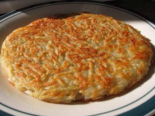 Рёшти - швейцарское национальное блюдо из картофеля. Ингредиенты: Масло сливочное — 120 грамм Картофель — 1 килограмм Соль Масло растительное Приготовление: 1. Режим клубни крупными кусками, кладем в кастрюлю. 2. Заливаем все кипящей водой, ставим на огонь и варим до полуготовности (5-6 минут после закипания). 3. Сливаем воду и остужаем картофель. Трем картофель на крупной терке. Отдельно растапливаем сливочное масло. 4. В сковороде разогреваем растительное масло. Выкладываем картошку в три слоя, каждый слой солим и поливаем сливочным маслом. 5. Выкладываем оставшееся сливочоное масло. Жарим картофель на среднем огне до румяной корочки(около 5 минут). Затем переворачиваем и повторяем. 6. Приготовленное блюдо оставляем на сковороде несколько минут, затем подаем, разрезав как торт.