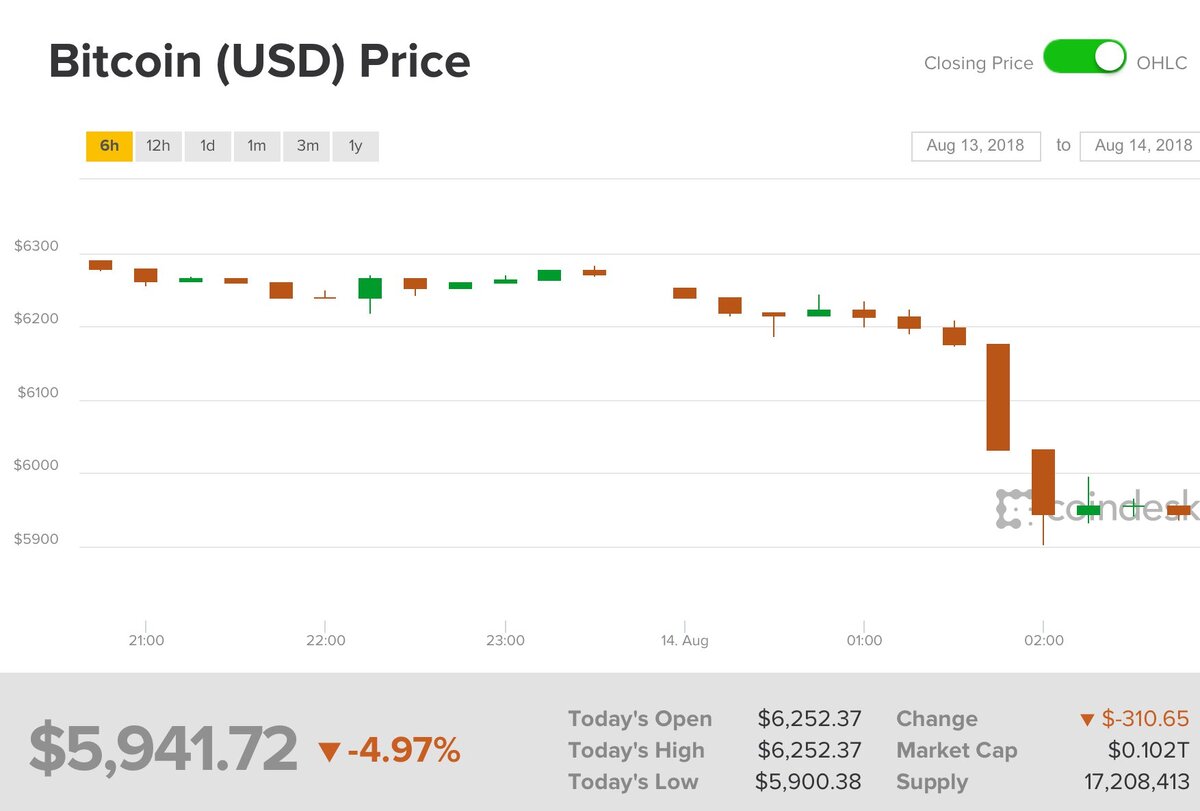 Цена биткоина упала ниже $6000 во вторник, что привело к тому, что крупнейшая в мире криптовалюта находится в 2% от минимума 2018 года. На момент публикации биткоин торгуется по цене $5,922; наблюдается 5% снижение стоимости за 24 часа, согласно индексу цен на биткоин CoinDesk, немного выше минимума $5,785, который был установлен 24 июня.