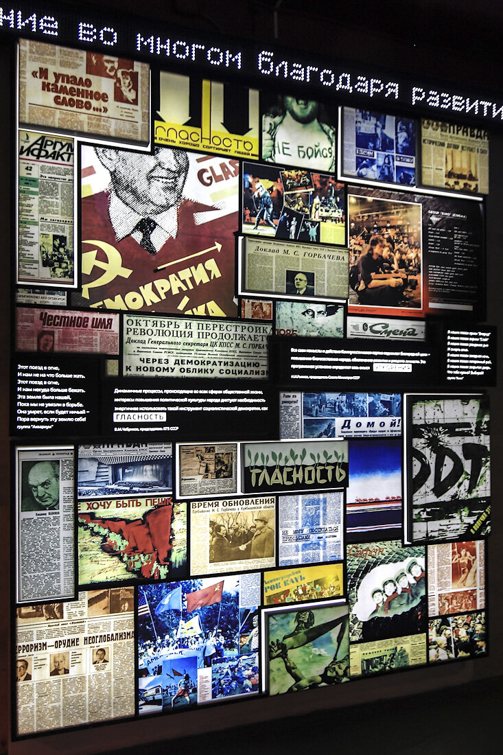 Последний период жизни СССР и приход новой России в экспозиции музея политической истории. Пришли 1980-е годы. Стало понятно, что дальше так жить нельзя. Были предприняты робкие попытки вернуться к истокам.