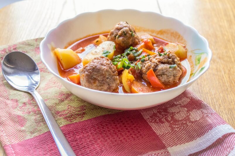 Поделюсь рецептом крутейшего супа! Впрочем, он получается настолько густым, что и супом-то не назовёшь. Скорее, это нечто среднее между супом и тушёными овощами. Но как ни называй — блюдо очень вкусное и красивое! Готовится легко и быстро, а ингредиенты простые и в это время года весьма доступные. Ну, приступим! Приготовим такой овощной суп с фрикадельками на 4 (крупных!) или 6 (стандартных) порций. Делаем фрикадельки! Берём 500 г домашнего (говядина и свинина) фарша. На крупной тёрке натираем в него 1 небольшую луковицу. Добавляем 1 яйцо. Всё вымешиваем. Добавляем соль и черный молотый перец по вкусу. Ещё раз тщательно перемешиваем. Катаем фрикадельки, а чтобы это делать быстрее, смачиваем руки водой. Обваливаем их в муке. И обжариваем в разогретом растительном масле. Почти до готовности, чтобы держали форму. Откладываем в сторону. Готовим овощи Очищаем 4-5 крупных картофелин, 1 немаленькую морковку, 3 болгарских перца и несколько зубчиков чеснока. В большом глубоком сотейнике разог
