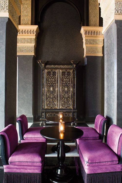 Французское слово “Lilas” одновременно означает и “сирень”, и “сиреневый”, то есть “лиловый”. Дивный лиловый цвет! Сколько в нём оттенков, какова палитра: от бледного цвета душистой ночной фиалки до глубокого насыщенного фиолетового в самых тёмных из анютиных глазок! А между ними – и сирень, и лаванда, и ирис… Таинственный лиловый цвет прекрасно сочетается с серебром, белым, жёлтым, розовым, оранжевым, чёрным и серым. Лиловый – это цвет, которого в интерьере не должно быть много. Если всё помещение от потолка до пола в сиреневых тонах – это моветон! Считается, что в каждом интерьере должен быть запоминающийся жест, как, например, в этой гостиной. В старинных интерьерах, как правило, высокие потолки и много пространства. Размеры высоких окон пропорциональны высоте тёмно-серых стен, переходящих вверху в богатейшую золотую скань декора. Инкрустированный золотом чёрный шкаф прекрасно гармонирует с чёрными овальными столами. А божественные лиловые диваны и есть тот жест, о кот