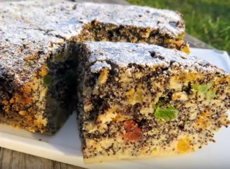 Нежный, воздушный, в меру сладкий - полный восторг ! Приступаем! Нам понадобится: мак 200 гр сахар 150 гр манная крупа 100 гр лимон 1/2 шт цукаты 100 гр курага 50 гр ( можно заменить на изюм, чернослив) сливочное масло 125 гр яйца 5 шт сода 1 ч. л яблоки 2 шт (300 гр) Мак и курагу зальём кипятком и даём постоять 30 минут. За это время нарежем цукаты на кусочки помельче. Затем нарежем на мелкие кусочки и набухшую курагу. С мака сольём лишнюю воду и перекладываем мак в блендер, высыпаем туда же часть сахара, так мак лучше перетрётся. Соединяем в одной миске мак, курагу, цукаты, манку. Перемешиваем. Очищенные яблоки натираем на крупной тёрке и добавляем к маку, поливаем их сверху лимонным соком. В другой миске перетираем мягкое масло с остальным сахаром. По одному вбиваем яичные желтки, в конце взбивания добавляем соду. Белки отдельно взбиваем до мягких пиков в миксере. Соединяем вместе маковую и масляную смеси. Затем добавляем по частям белки и аккуратно перемешиваем. Перекла