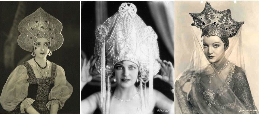 Удивительно забавные и странные съемки голливудских актрис эпохи немого и черно-белого кино в традиционном русском головном уборе.