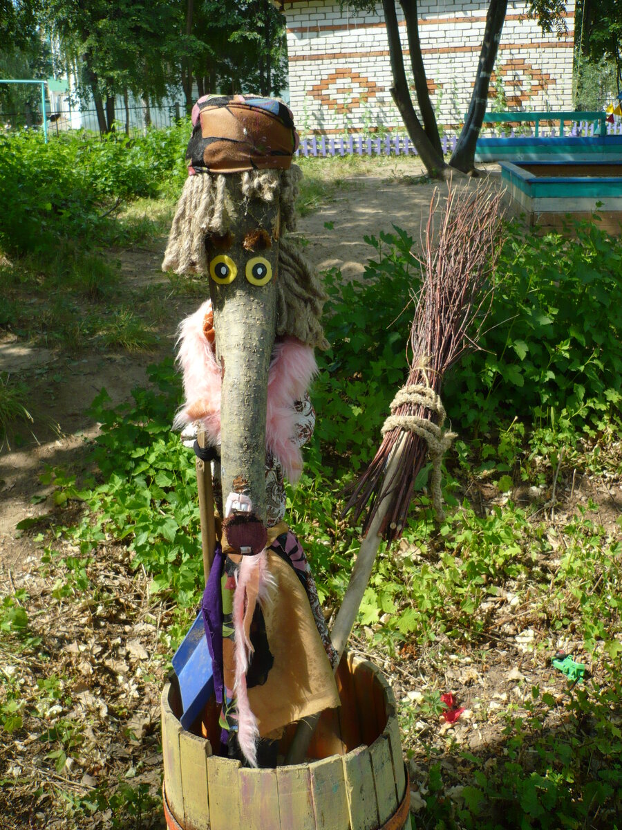 Баба Яга, как водится, сделана из бросового материала. Да и домик её тоже. Но есть в его антураже некие предметы, которые ввели буквально в ступор наших гостей. К нам приезжали студенты из Германии-будущие ландшафтные дизайнеры. Они с таким удивлением рассматривали что бы вы подумали? Правильно! ПРОИГРЫВАТЕЛЬ И ПЛАСТИНКИ. Именно по этим предметам у них к нам было сто вопросов))) Что это такое? как оно работает? и работает ли? и где мы этот раритет...купили? и как это мы не боимся его на улице оставлять, такой дорогой?