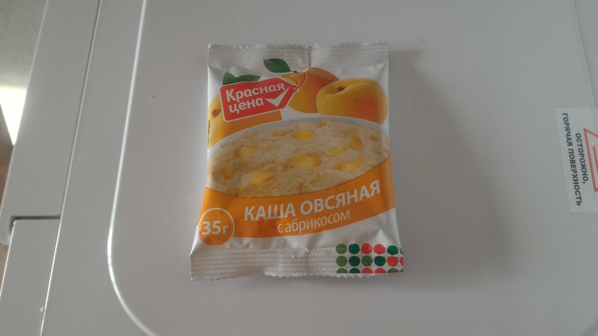 Каша в маленьком пакетике. Вес всего 35 грамм. Навряд ли этого достаточно для сытного завтрака. Состав На каша состоит из овсяных хлопьев, сахара, сушеного абрикоса, соли и ароматизатора "Абрикос". Отлично. Можно сказать натуральный продукт, за исключением ароматизатора. Но без продуктов осталось уже мало. Высыпаем содержимое пакетика в тарелку. Видим цельные овсяные хлопья, маленькие кусочки абрикоса и все это в светлом порошке, видимо измельченные соль и сахар. Заливаем все это кипятком и ждем 5 минут, как написать на упаковке. Пробуем Хлопья и кусочки абрикоса набухли. Каша стала похожа на овсяную. Но ее по прежнему мало. Некоторые хлопья не до конца разбухли. Но каша в целом вкусная. Не приторная, в меру сладкая. попадаются кусочки фрукта. Конечно это не геркулес, сваренный на молоке, но для блюда, приготовленного за 5 минут вполне неплохо. Вполне съедобно, можно покупать. Есть пакетики еще с другими фруктами и без них. Второй вопрос, можно ли этим наесться. Конечно нет. Но если