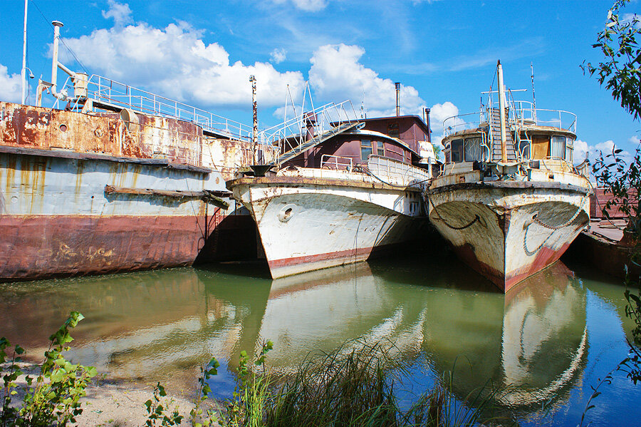 Есть у нас такой жилой массив, Затон называется. Там действующий порт, плавают баржи и рыболовецкие корабли. Но помимо них, здесь же догнивают давно нерабочие судна. Ничего масштабного, но полазить, по-фотать, довольно интересно =)