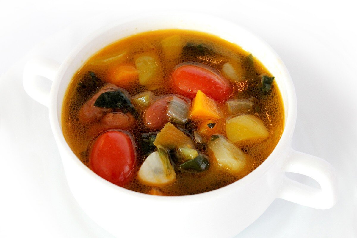 Продукты2ч.л. оливкового масла, 100г. грудинки или бекона(нарезать кубиками) 1 банка 400 г консервированных очищенных томатов кусочками( желательно с базиликом) 5 стаканов ( 1.2л)овощного бульона 1 пакет(225г)замороженной овощной смеси горсть(50г)макарон (длиные разломать) 100г замороженной стручковой фасоли. 1 банка(410г) красной фасоли( слить сок).1 ст.л.приправы песто крупно молотый черный перец тертый сыр пармезан Приготовление. 1.Разогреть оливковое масло в сотейнике или кастрюле,положить грудинку бекон и обжаривать 2-3 минуты,до золотистой корочки. 2.Добавить томаты,бульон и овощную смесь(не размораживая),довести до кипения и бросить макароны.Убавить огонь и варить 5 минут. 3.Добавить стручковую зеленую и красную фасоль,варить еще 5 минут,пока овощи не станут нежными.