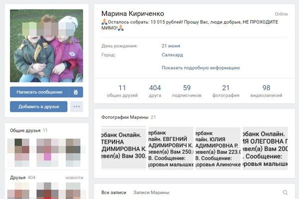 Страница, якобы принадлежащая жительнице Салехарда Марине Кириченко, прожила в соцсети «ВКонтакте» недолго. С начала августа автор аккаунта размещала в нём ничем не примечательные посты и подписывалась на профили множества местных жителей, успев собрать четыре сотни «френдов». Затем настало время для другого сбора, ради которого всё и затевалось. Вчера днём на странице появилось объявление – «Марина» обратилась к горожанам за помощью для срочного лечения больной дочери. В личной переписке она призывала салехардцев помочь деньгами и делиться сообщением, чтобы его увидело как можно больше народу.
