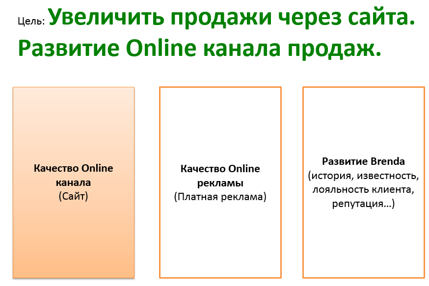 Картина примерно такая. Что получается? Вы приходите, как новый сотрудник, на направление online продаж, как маркетолог и видите эту картину. Из этой ситуации понятно, что руководство не готово вкладывать большие средства в рекламу, разработку нового сайта и т.д., но хочет начать развивать тему Online.
