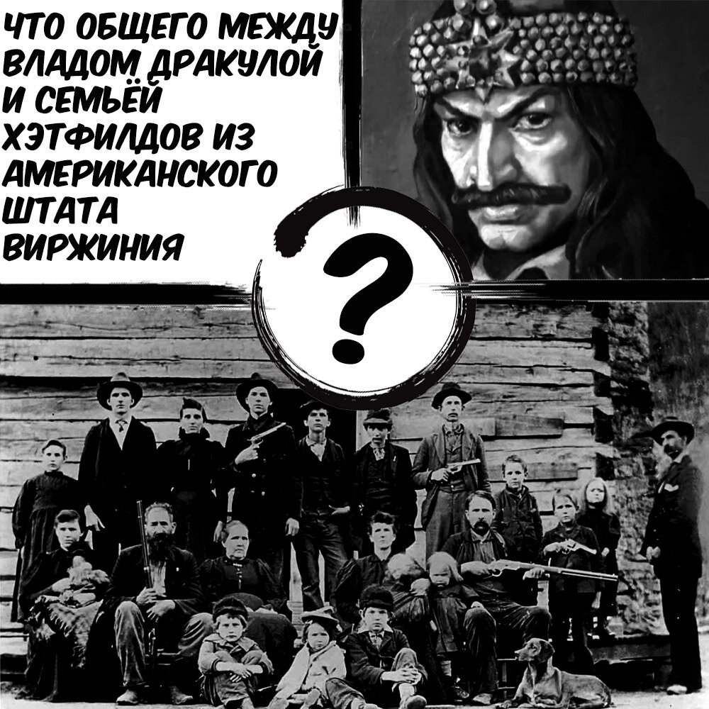 Надеемся, что Влад Дракула в представлении не нуждается. Семья Хэтфилдов из американского штата Виржиния в прошлом "прославилась" многолетней враждой с семьей МакКой из штата Кентукки. Кровавые разборки между семьями послужили причиной установления административной границы между штатами Виржиния и Кентукки. Что общего между Владом Дракулой и семьёй Хэтфилдов из американского штата Виржиния? 1. Боролись за власть 2. Про них сняли фильм 3. Принадлежат к одному роду Проголосовать можно здесь: https://vk.com/genealogiya_dlya_vseh?w=wall-134291398_3753 Или написать ваш вариант ответа в комментариях Правильный ответ будет завтра)))