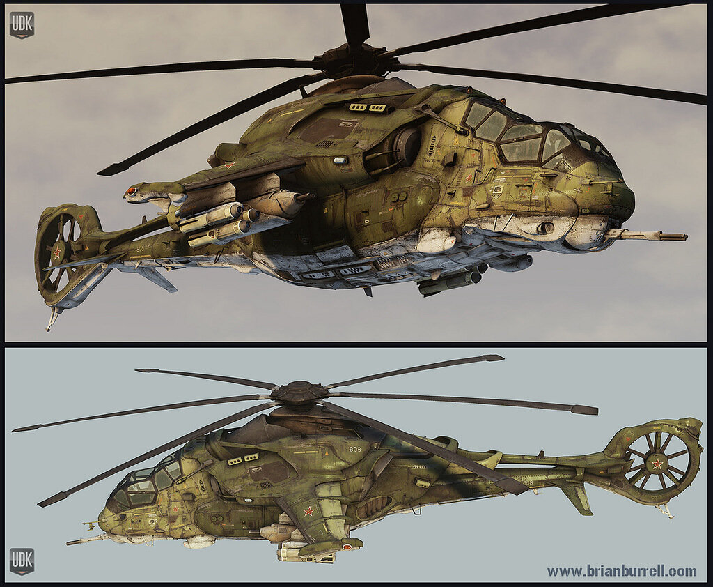 Таким его представил себе художник-футурист Brian Burrell из Нью-Йорка. Художник говорит, что ему всегда очень нравился дизайн российского боевого вертолета Ми-24.