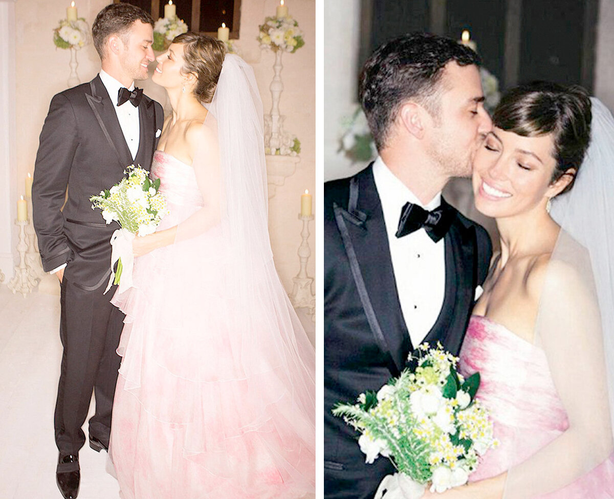 Джессика Биль признаётся, что в выборе свадебного наряда руководствовалась одним-единственным правилом — её платье должно было быть «романтичным-романтичным». Отступить от канонов актриса решила, едва увидев платье своей мечты на показе итальянского дизайнера Giambattista Valli. Звезда и раньше украшала красную дорожку различных мероприятий в творениях маэстро, поэтому её выбор показался многим поклонникам очевидным. Пышное розовое платье, на которое ушли метры органзы и шёлкового муслина, украшала ручная вышивка с цветочными мотивами и множество оборок. Пока свадьба Джессики и её возлюбленного, певца Джастина Тимберлейка, «пела и плясала», невеста сменила ещё 4 наряда, но главный, вызвавший ожидаемый восторг как фанатов актрисы, так и модных критиков, не смог затмить ни один другой. Впрочем, нашлись и те, кто не побоялся сравнить платье новоиспечённой миссис Тимберлейк с тортом.