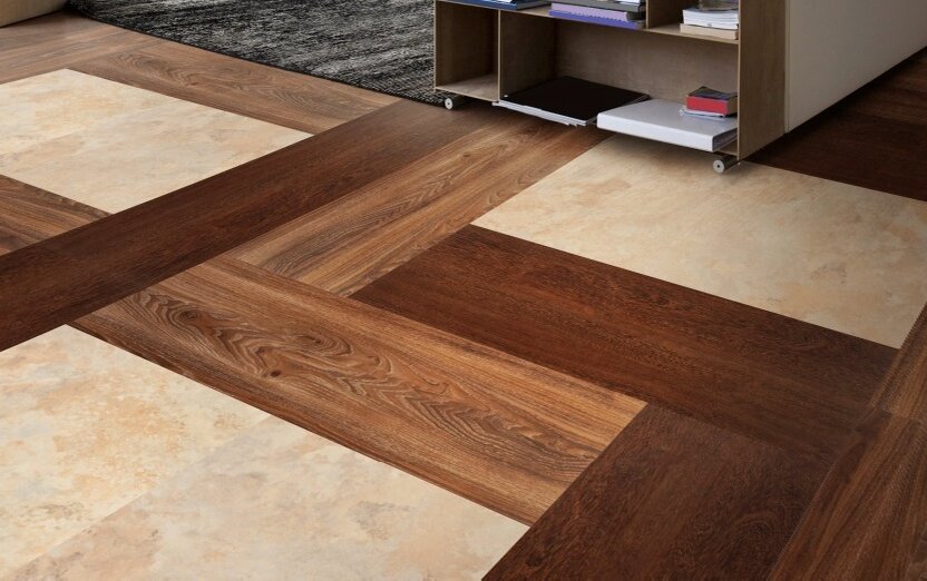 Данный вид напольного покрытия хорошо подходит для укладки не только в общественных, но и в жилых помещениях. Виниловая плитка это тот же линолеум, только выполнен в виде плит. При укладке виниловой (ПВХ) плитки можно выполнить довольно разнообразный и красочный пол. Плюс еще в том, что это напольное покрытие относительно легко заменяемо, так как состоит из плит, а не в виде рулона как линолеум. В свою очередь, надо признать, что виниловая (ПВХ) плитка является ненатуральным материалом и это одна из причин, которая отталкивает потребителя. Это напольное покрытие имеет разные названия, в том числе, кварц виниловая плитка, так как в ее состав входит кварцевый песок. На наш взгляд, виниловая плитка также недооценена. Золотое правило, что хороший материал дешевым быть не может, оправдывает себя. Практика в укладке данного напольного покрытия показала, что дешевая виниловая плитка плохо ведет себя при укладке, края ее не симметричны (не ровны) что приводит к образованию шва между плитками,