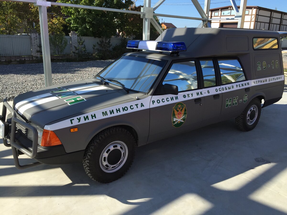 Автомобиль Москвич «Черный дельфин» был подготовлен для проведения серии торжественных мероприятий посвященных 135-летнему юбилею уголовно-исполнительной системы России.По техническому требованию заказчика должен был быть соблюден ряд условий, среди которых ТС должно быть отечественным, малосерийным и должно соответствовать по времени производства и содержанию атрибутики переходному периоду становления уголовно-исполнительной системы 90-х годов и отражать наиболее полно дух истории того времени в наиболее ярких ее проявлениях.