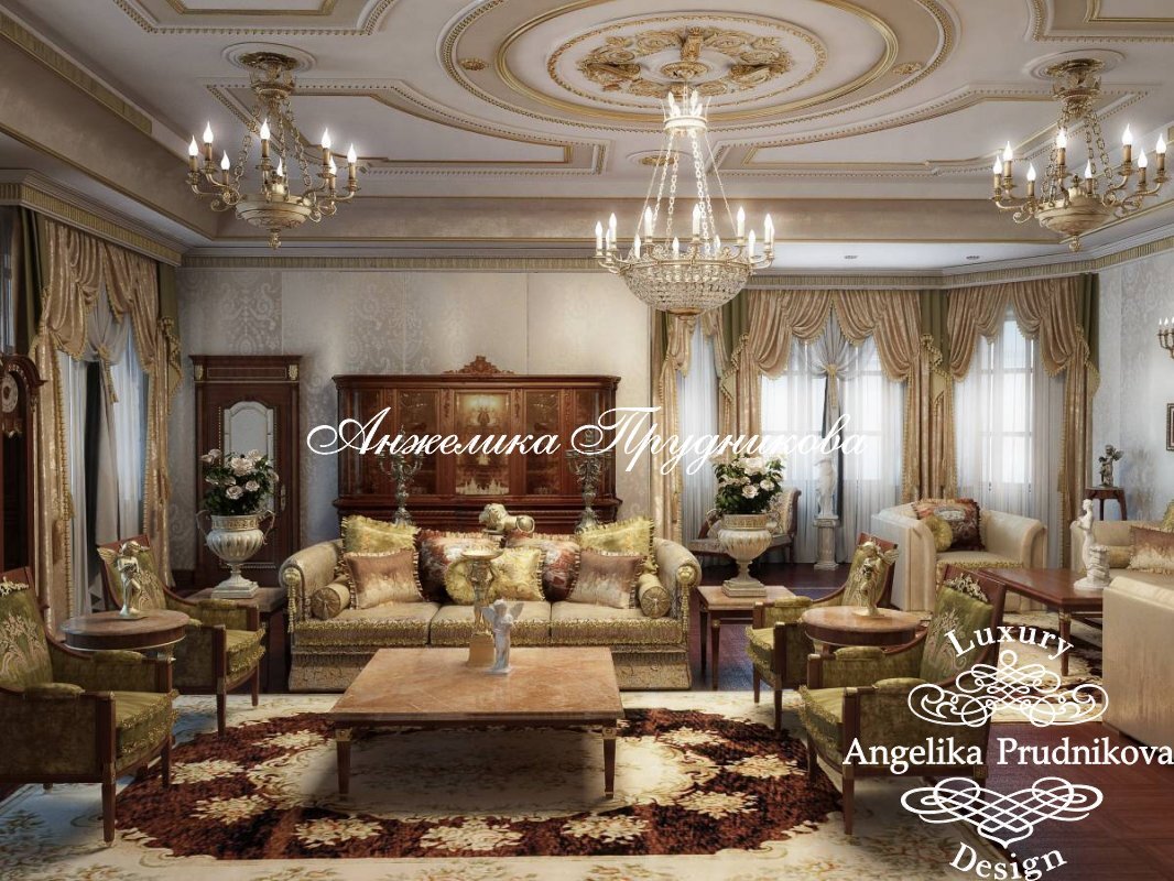 Дизайн дома в классическом стиле, благодаря потолочным фрескам, мраморным колоннам, поддерживающим высокие своды, золотистым бра и люстрам, напоминающим подсвечники, отсылает к эпохе николаевских балов. Такой интерьер разрабатывается на века. Гостиная с эркером, античными вазами и скульптурами вполне достойна того, чтобы стать салоном толстовской Анны Шерер. Под пышную столовую дизайнер Анжелика Прудникова отводит целый зал с колоннами. Синие стулья с подлокотниками здесь «перекликаются» с голубой подсветкой, пущенной по периметру потолочной фрески. Внутри дома в Серебряном Бору нашлось место и для бильярдной, и для домашнего кинотеатра, дизайн которых, согласно фото, также решен в классическом стиле. Респектабельная мебель с «каретной» стяжкой, пилястры и лепнина формируют подходящую обстановку для игры в карамболь. В домашнем кинотеатре, благодаря грамотной обивке стен и потолка, обеспечивается великолепная акустика. Предусмотрен в доме и кабинет в современном стиле, где, глядя на