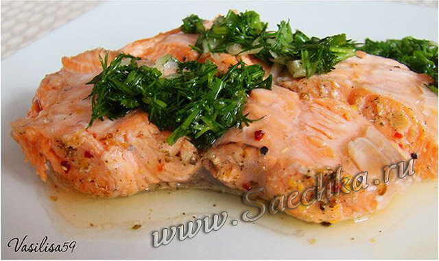 Диетическая форель (сёмга) приготовлена с укропно-чесночным соусом в пароварке.