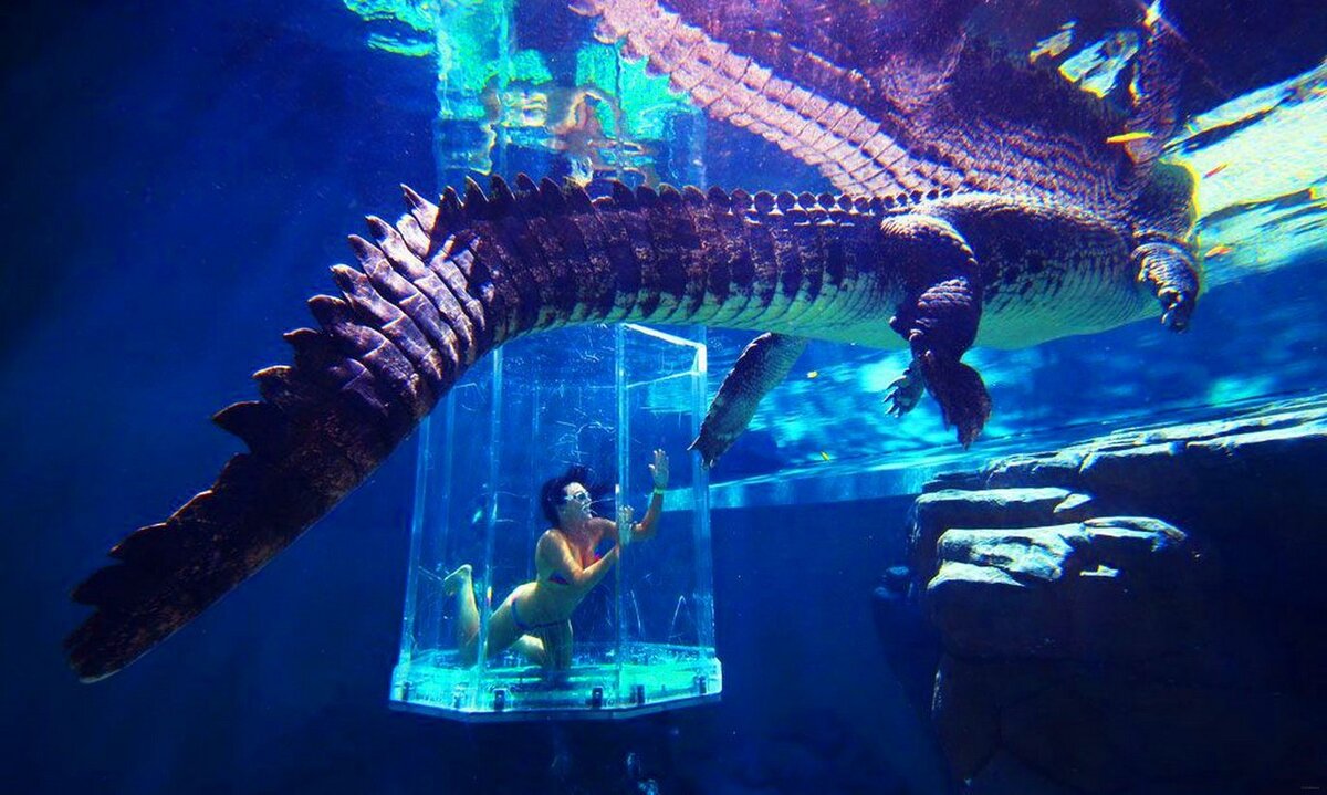 Еще совсем недавно человека можно было запугать стаями акул и ужасающими взглядами крокодилов. Но время немного изменилось. Теперь каждый хочет почувствовать долю адреналина, прибегая к всевозможным способам. Именно поэтому местные власти города Дарвин решили озадачить туристов, разнообразить их пассивный отдых.абы привлечь отдыхающих, в парк аттракционов были завезено несколько крокодилов. Для них создали специальные условия жизни. Бассейн, в котором они плавают, надежно защищен от любопытных посетителей. Толщина стеклянного корпуса составляет 15 см. Но самое интересное начинается тогда, когда желающие спускаются в стеклянной колбе в бассейн. Крокодилы начинают активно рассматривать свою жертву. А человек в это время может свободно наблюдать за всеми действиями животного. Этот аттракцион был прозван Бухта крокозавра. И не каждый смельчак пожелает познакомиться поближе с крокодилами. Даже организаторы подобного мероприятия считают этот эксперимент не очень удачливым для психики. У них