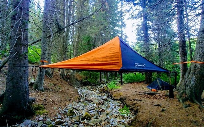 У традиционной «наземной» палатки есть серьезный недостаток: внутренний комфорт в ней во многом зависит от того, насколько ровное место для установки выберет ее владелец. Неровная площадка в сочетании с холодным грунтом – почти наверняка гарантия нервной бессонной ночи. В связи с этим все большей популярностью пользуются подвесные палатки, которые крепятся к деревьям. Примером тому – палатка-гамак компании Multimok – Bivymok. С помощью специального шеста и нескольких подвесных лямок она крепится к соседним деревьям, обеспечивая своему владельцу максимальную безопасность и комфорт в условиях похода, в частности, от насекомых и диких животных. Вход в палатку – снизу через расстегивающееся отверстие. Размеры Bivymok – 1,2 х 2,4 метра, что вполне достаточно для размещения двух человек, у которых к тому же есть возможность кругового обзора окружающего пространства через полиэстеровую сетку. Палатка-гамак может выдержать до 450 кг, благодаря еще одной сетке из полиэстера. Она также надежно