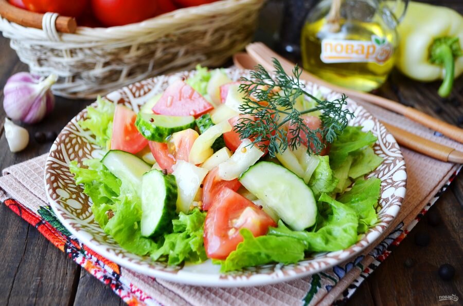 Приготовьте летний салат! К огурцу и помидору добавьте болгарский перец, а соус сделайте из рубленого чеснока, дижонской горчицы, уксуса и растительного масла. Простой салат с пикантной заправкой на каждый день готов!