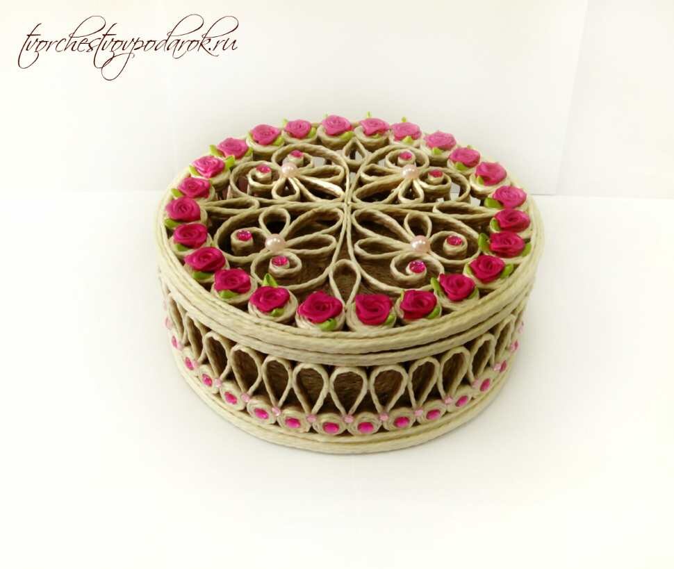 И снова приветствую всех на своих страничках Творчества в подарок! Хочу порадовать вас своей новой идеей из джутового шпагата. Это шкатулка с цветами. Решила я попробовать применить в качестве декора текстильные цветы. Долго выбирала размер, цвет и материал цветов, чтобы в итоге работа смотрелась гармонично и завершенно. Остановилась я на розочках из атласных лент. Ленту выбрала тонкую, чтобы цветочки получились небольшого размера. Скажу честно, делать такие бутоны, да еще из скользких атласных лент, дело вообще не мое… Не заточены мои пальцы под такой вид творчества. Поэтому, если еще и буду экспериментировать с цветами, то сама их делать буду вряд ли. Но чем мне особо понравился этот опыт, это то, как красиво, естественно и выигрышно смотрятся цветочки на фоне ажурных узоров из джута. Пастельные тона создают нежное настроение романтичности, а яркие – веселое и жизнерадостное. Шкатулка с цветами позволит угадать даже самое непредсказуемое женское настроение! Такая полянка не оставит р