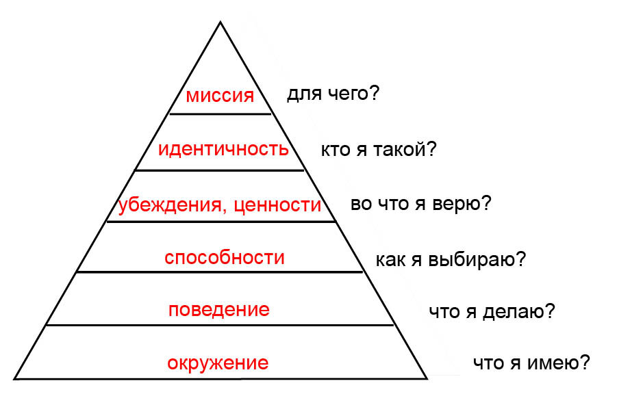 На обучении по коучингу нам дали классный инструмент. Я поработала с ним сама и хочу поделиться с вами. Пирамида Роберта Дилтса названа в честь ее создателя, известного НЛП практика, психолога и тренера. Он предложил удобную для описания жизни модель в виде пирамиды. Выделяем полчаса времени и тишины, рисуем пирамиду и честно перед самим собой отвечаем на вопросы. Пирамида Дилтса состоит из шести логических уровней (ступеней). Каждая ступень непосредственно связана с предыдущей и последующей. Особенность модели в том, что если вы отвечаете честно на вопрос и вас не устраивает ваш же ответ (например: что я делаю? сижу часами в соц.сетях перед сном), то ответ на вопрос «Почему так происходит?» вы можете найти на уровень выше. Теперь подробнее про уровни. Нижний уровень пирамиды - уровень быта, повседневности, отвечает на вопрос «Что я имею?» Ответьте на этот вопрос максимально подробно. Дом, семья, ваш круг общения, работа, деньги, предметы, которые вас окружают… Все это составляет вашу