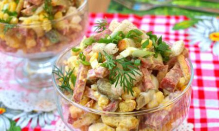 Ингредиенты: колбаса копченая 100 гр. сухарики белые 100 гр. яйца 3 шт. огурец маринованный 2 шт. кукуруза консервированная 4 ст. л.
