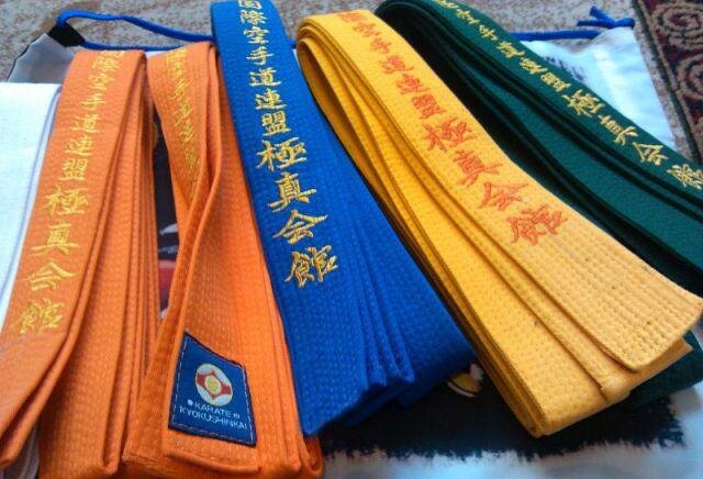 Как и в большинстве воинских искусств Японии, в киокушинкай карате различают ученические (кю) и мастерские (даны) степени. В киокушинкай десять кю (от 10-го до 1-го) и десять данов (от 1-го до 10-го). Каждой степени соответствует пояс определённого цвета с одной или несколькими поперечными полосками (или без них), нашитыми на правый конец пояса. Данам соответствует чёрный пояс. На него нашиваются жёлтые (золотые) полоски, число которых соответствует дану (от 1-го до 9-го). Десятому дану соответствует красный пояс. Система цветности ученических поясов отличается от системы цветности в других стилях и школах и имеет более глубокое значение, чем переход от светлого цвета к тёмному при увеличении степени. Цвета ученических поясов объединены в пять групп, имеющих один цвет, на пояс, соответствующий более старшему кю, нашивается полоска цвета более старшей группы (исключение — пояс 1-го кю имеет жёлтую полоску, хотя можно увидеть и чёрную). Также в некоторых школах 10-9 кю соотв