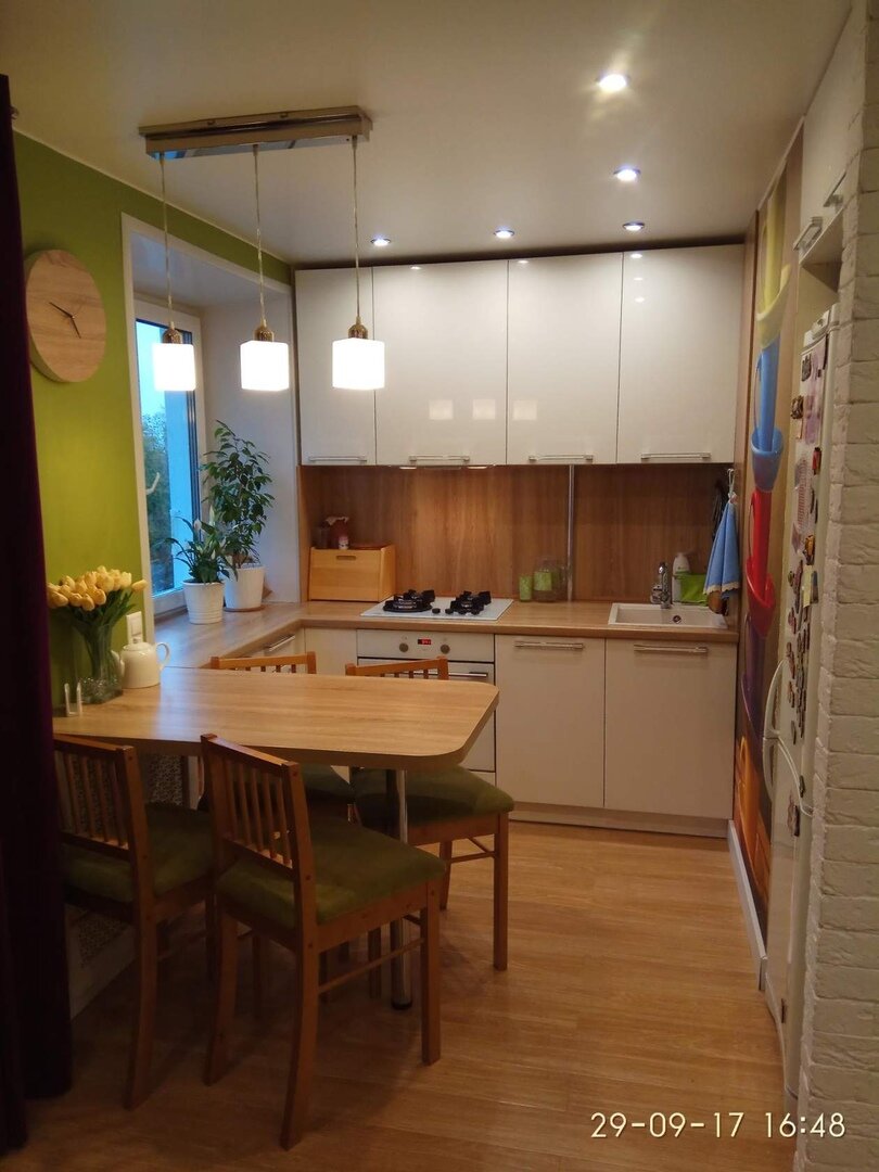 В данном случае, перед нами кухня с небольшой традиционной перепланировкой. Снесли стенку между кухней и гостиной и воздвигли перегородку между коридорчиком. Эта кухня притягивает к себе внимание прежде всего за счет используемых в интерьере ярких цветов. За счет ярких акцентов не замечаешь саму простую белую кухню с фартуком в цвет ламината. Но, давайте, все же рассмотрим помещение по порядку. И начнем с традиционного расположения мебели и техники, а затем посмотрим на все яркие акценты вблизи. Расположение мебели и техники Имеет смысл начать рассмотрение справа на лева. Низ: Углом, в нише, где был хрущевский холодильник: Верх высокие шкафы, симметричные нижней части: Обеденная зона: Стол выполнен из столешницы и выглядит, как единое целое. Фишки кухни: Яркий постер с чашечками привлекает к себе внимание. Служит ярким пятном. делает кухню запоминающейся. Кстати, стоит заметить, что цвет фона обоев идеально вписался в цвет стеновой панели. Обратите внимание! Рядом с холодильником нах