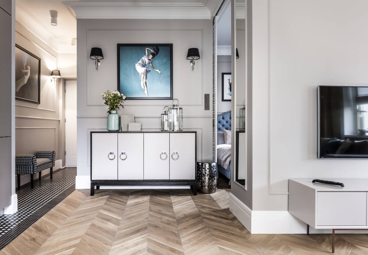 Слишком большая прихожая считается скорее недостатком новостроек. Разберёмся, как превратить лишние квадратные метры в полезную площадь. 1. Гардеробная/прачечная Если холл действительно слишком большой, то часть его можно просто отвести под гардеробную или постирочную. Другой вариант – превратить саму прихожую в одну просторную проходную гардеробную. Совет: во встроенных системах хранения можно даже скрыть стиральную и сушильную машины. 2. Шкаф и открытая вешалка Считается, что в маленькой прихожей достаточно шкафа размером 60х45 см. Но если метраж позволяет, можно установить более вместительную модель. Ведь в прихожей часто хранятся ещё и бытовые принадлежности, например, швабры и пылесос. Совет: для верхней одежды порой стоит предусмотреть ещё и открытую вешалку, чтобы мокрое или испачканное пальто или куртку не пришлось вешать сразу в шкаф. 3. Обувница Специальные комоды для обуви хороши тем, что обычно бывают узкими и занимают минимум места. Их альтернатива – специальные кре