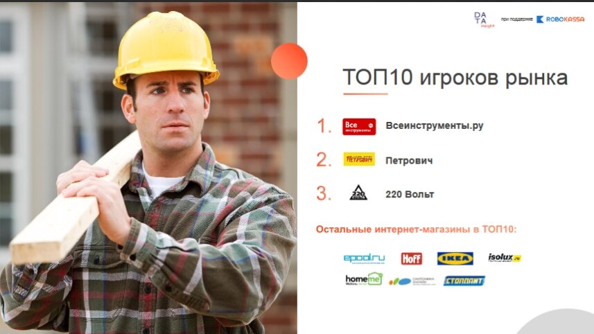 Data Insight при поддержке Robokassa представляет результаты исследования "Онлайн-рынок товаров для дома и ремонта". В исследовании рассматриваются интернет-магазины товаров для дома и ремонта, вошедшие в ТОП1000 по количеству заказов за I полугодие 2017 года. Ключевые тезисы Презентация исследования Скачать презентацию Онлайн-рынок товаров для дома и ремонта (pdf, 5 MB) Также читайте наши исследования "Онлайн-рынок медицинских товаров", "Онлайн рынок детских товаров" и "Онлайн рынок одежды и обуви" Полная версия исследования: Также вы можете купить полную версию исследования сектора товаров для дома и ремонта, подробнее - datainsight.ru/DIY2017
