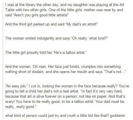 На днях я была в библиотеке, и моя дочь играла с двумя другими девочками за Столиком Искусств. Мама одной из девочек была неподалёку и сказала: «Девочки, вы настоящие художницы!» И одна из девочек сказала: «Мой папа художник!» Женщина снисходительно улыбнулась и сказала: «Ох, правда, а какой художник?» Малышка гордо сказала: «Он тату-мастер!» И эта женщина... боже. Её лицо мгновенно изменилось, скорчилось в ужасную гримасу, она открывает рот и говорит: «Это не...» «...не лёгкий труд» - прервала ее я, глядя ей прямо в глаза, потому что, блять, серьёзно? Ты собираешься сказать ребёнку, что её отец не художник? Я продолжила: «На самом деле, это очень-очень трудно, потому что рисунок вечно жив на теле человека, это не бумага. И это пугает! Чтобы быть тату-мастером, ты должен быть очень хорош. Твой отец, должно быть, ОЧЕНЬ хорош!» Кем вообще нужно быть, чтобы взять и разрушить мир маленького ребёнка? К чёрту этот мир.