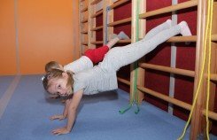 1) Подтягивания на параллельных брусьях - исходное положение: ребенок за одну жердь берется руками, за вторую цепляется коленями и начинает подтягиваться самостоятельно вверх так, чтобы подбородок оказался выше перекладины. После 10 раз подтягиваний задержаться в положении «подбородок выше перекладины» на 10 секунд. Выполнять 2 подхода по 10 раз.