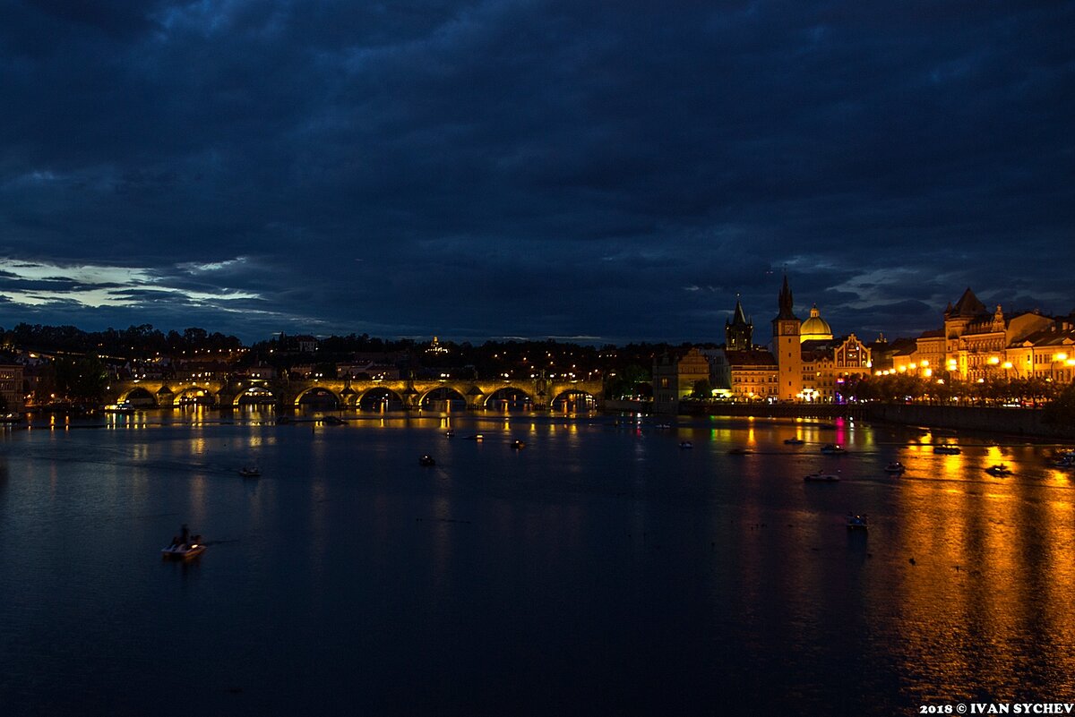 Сама по себе, имеющая очень средневековое лицо (если мы говорим о центре), Прага из каждого дома или переулка так и дышит загадочностью и мистикой. Кроме того, у пражан (или может быть даже у всех чехов) есть некий пунктик - они уж очень любят скелеты и черепа. В крайнем случае - кости. Много вывесок, каких-то скульптур, рисунков посвящены этой теме. Есть даже целая часовня - Костница, полностью оформленная человеческими скелетами. Но я сегодня о другом, я о вечерне-ночных видах Праги. 1. Вид на Староместский берег Влтавы и Карлов мост. Там, среди узких улочек, убегающих от освещенной набережной Сметаны (ударение на первый слог, как и во всех словах чешского языка) говорят до сих пор видят призраков. 2. Карлов Мост ведет со стороны Старе-Место (дословно - Старый Город) на Малостранскую сторону (Мала Страна - малый город) над которым возвышается Карлов град и его доминанта - Собор Святого Вита. Готический собор в достаточно скудной подсветке выглядит несколько зловеще. 3. А на Старомест